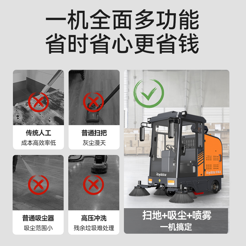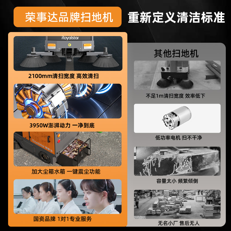 一臺榮事達掃地機可節(jié)省約16-18人勞動成本,4-5h超長續(xù)航,21000㎡/h清掃效率,2100mm清掃寬度,強勁...